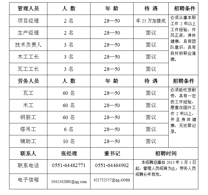 因安徽省第二建筑工程公司承建的阿爾及利亞阿爾及爾654套住房項目及太把薩大學(xué)城工程項目的需要,現(xiàn)公開面向社會招聘項目管理人員及勞務(wù)工人,具體招聘事項見附表。
