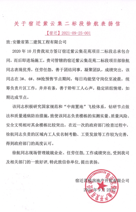 近日,第三分公司宿遷中南紫云集花苑項目的施工員徐航收到了一封業主單位發來的表揚信,平日大方灑脫的他在收到信后露出了靦腆的笑容,他表示:“這是自己的分內工作,以后會繼續保持”。平日里的徐航工作責任心強,在項目3#、4#、8#搶收節點期間,兢兢業業堅守崗位,每日加班加點至凌晨,在他和所在片區工人的努力下,項目如期完成節點任務。針對項目現場工作總是親歷親為,在面對裝配式項目的施工難點、重點工作時,通過對專業書籍的學習,不斷攻堅克難,提高能力,增強技能。他負責的片區在質量風險、勞務實名制等方面工作明顯優于其他樓棟的工作,在業主方“飛檢”、政府檢查中得到高度認可。