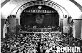 4月23日,在延安楊家?guī)X中央大禮堂,七大開幕式的主席臺上,懸掛著毛澤東和朱德的巨幅畫像,鮮艷的黨旗掛在兩邊。會場后面的墻上,掛著“同心同德”四個大字。兩側墻上張貼著“堅持真理”“修正錯誤”等標語,靠墻邊插著24面紅旗,象征著中國共產(chǎn)黨24年奮斗的歷程。插紅旗的“V”字形木座是革命勝利的標志。在主席臺的正上方,懸掛著一條引人注目的橫幅:“在毛澤東的旗幟下勝利前進!”